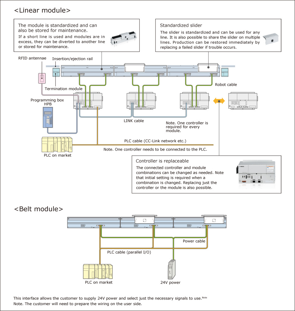 The guide connections, connection height, and stroke length are completely compatible between belt and linear modules. Reduced design and production labor will help speed up the start-up time. Note1