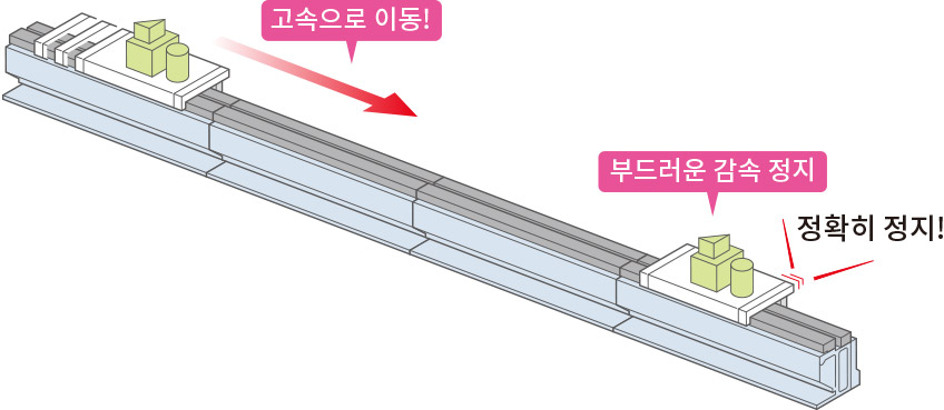 서보 제어를 통하여 부드러운 감속 정지가 가능하며, 스토퍼 충돌로 인한 워크 이탈, 손상 등이 없어 고속으로 이동할 수 있습니다.