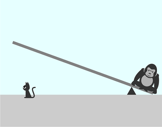 I see! The lightweight cat is the 50cc scooter engine, and since it’s so far away from the pivot point, you could say it has a “larger gear ratio.” The gorilla is like a liter bike engine and with its much smaller gear ratio being so close to the pivot point, the cat actually produces more torque!